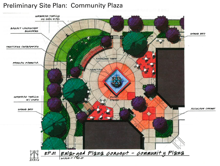 Proposed plaza design from the April 2013 plan reviewed by the Design Review BoardPlaza design from the city-approved building permits.