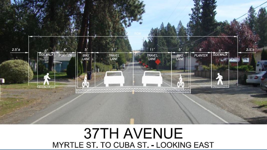 Last Thursday the City of Spokane Engineering Department held an open house at Chase Middle School to discuss the upcoming 37th Avenue Rehabilitation and Water Main Project. Starting in April 2016, the city will install a 36″ water main from Regal Street to Havana Street, repave the entire length of 37th, add sidewalks and bike lanes to both sides of the road. The project also includes improvement of stormwater management from the Hazel’s Creek area the city-owned empty lot at Rebecca and 37th (see rendering above).