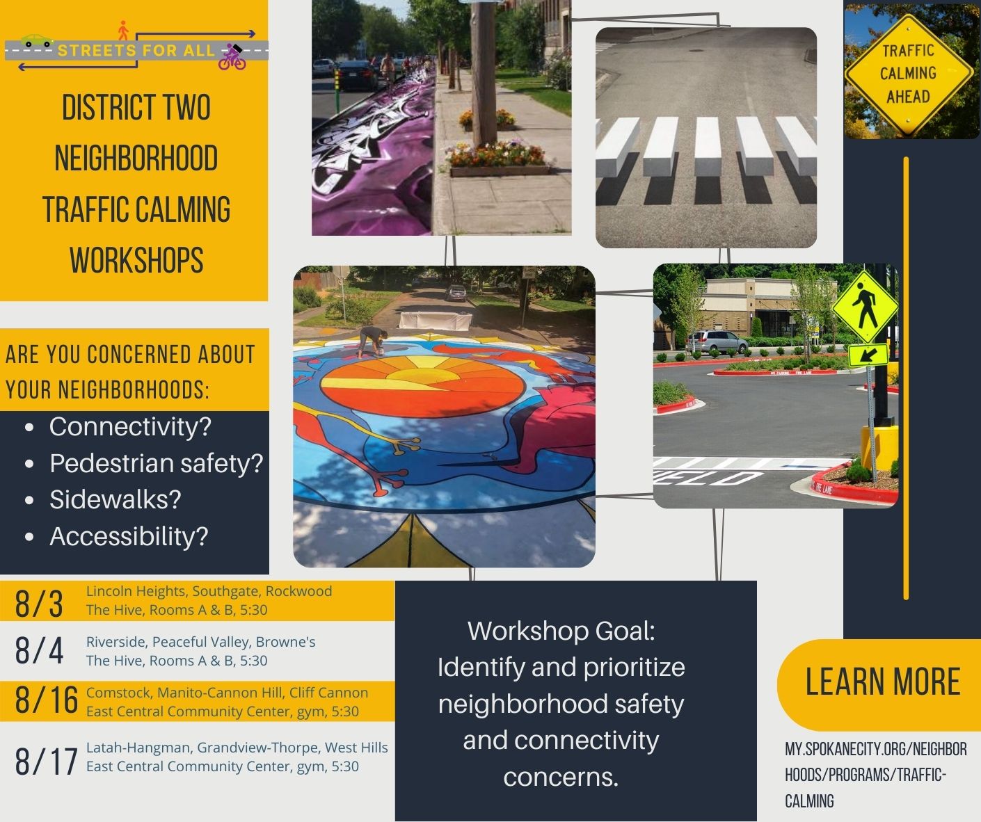 The City of Spokane is working on a 4 year traffic calming and pedestrian/bike safety plan and input from neighbors is vital to creating a great plan. If you’d like to weigh in, join the meeting Wednesday, Aug. 3, 5:30pm at the Hive, rooms A & B, 2904 E Sprague.