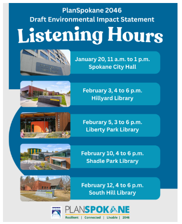 The City of Spokane Draft Environmental Impact Statement (EIS) is now available for public comment. The City is seeking comments to help inform future growth for Spokane. City Planners will be out in the community to answer questions about and discuss the Draft EIS. These are drop-in hours with no formal presentations. See you there!