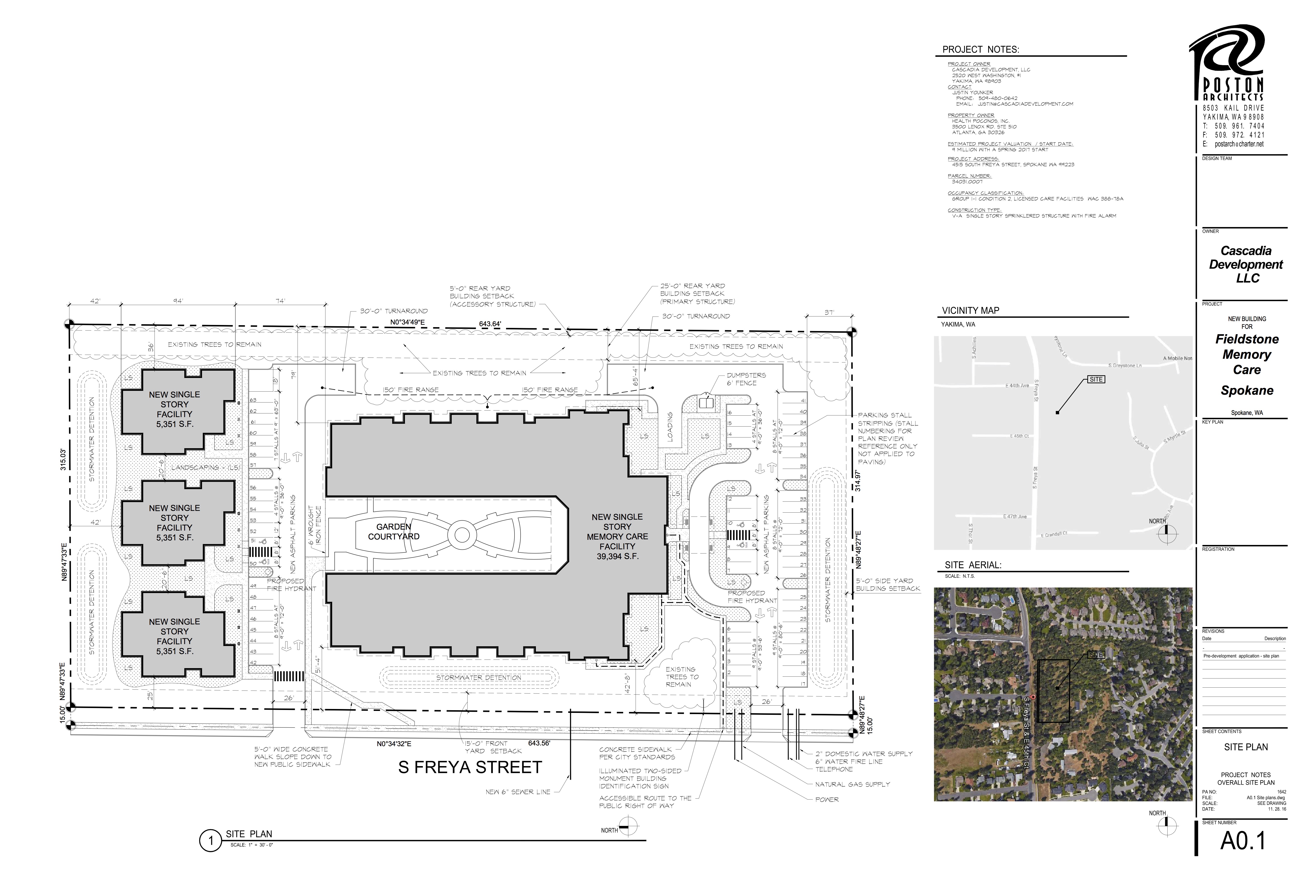The final building would look like other facilities managed by Fieldstone in Yakima and other places in Washington. The main building would be a one-story slab-on-grade structure with two wings. The main part of the building is two stories to accommodate an interior promenade and courtyard. The developers say their goal is to retain as much of the mature trees and natural landscape as they can between their facility and the properties to the east and to buffer the visual impact of the facility from Freya with screening trees and shrubs.