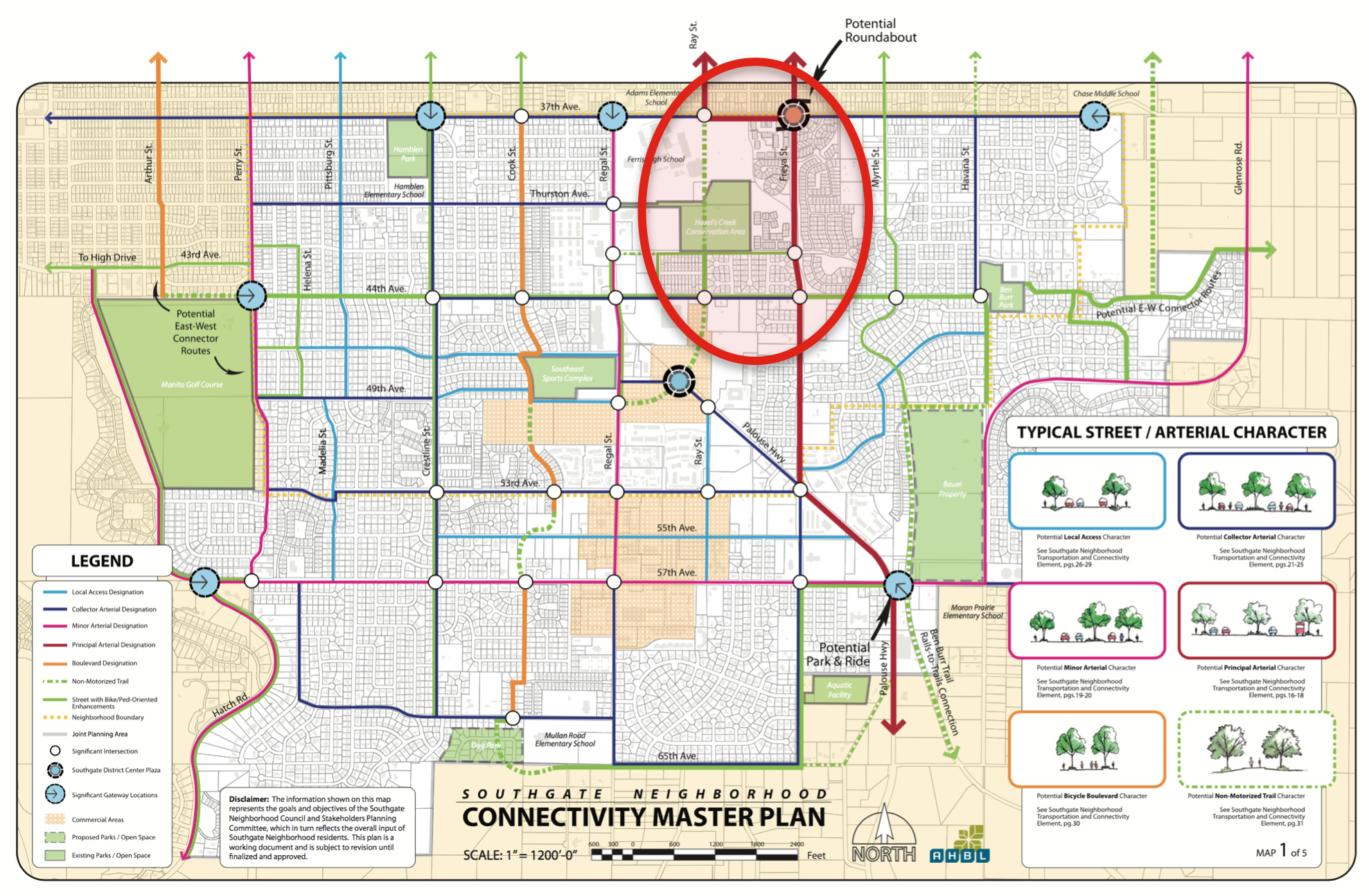 The city is resurrecting this project as a way to reduce perceived vehicular congestion on Regal Street and funnel more traffic over to our neighborhood’s designated Major Arterial, Freya Street. The crossover concept isn’t new. It was last floated back in the early 2000s (and even earlier than that), but was abandoned during the Neighborhood Planning process that took place from 2007 to 2010 because data from the City could not show how this proposed crossover would improve level of service better than signalization improvements to the intersections of 37th and Ray and 37th and Freya.  For this reason, and with the concurrence of the then-current Senior Traffic Planning engineer, the city-adopted Southgate Neighborhood Connectivity Plan does not include the Ray Street Crossover (see image below).