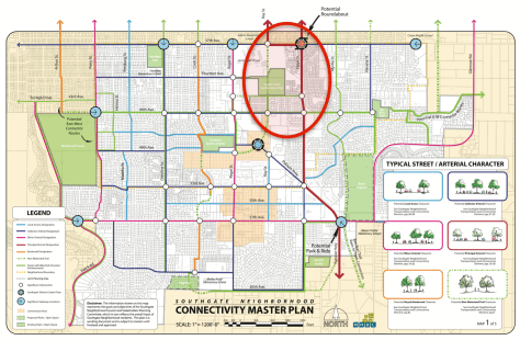 The neighborhood arterial map from the Southgate Connectivity Plan showing no crossover, but instead suggests intersection improvements only.