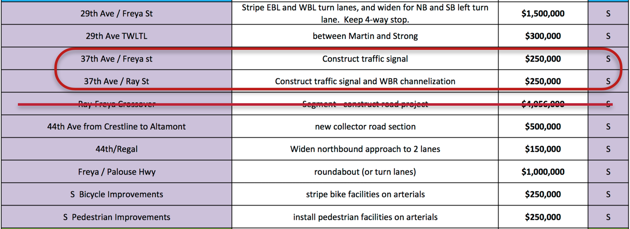 City staff have told neighborhood representatives that they have the ability to run the transportation model in-house. We requested that this model be run and the RCJ report adjusted to reflect the neighborhood’s preferred solution. The aforementioned 2017 Draft CIP List does include signalization of 37th and Ray and 37th and Freya as projects in the South region (see below).
